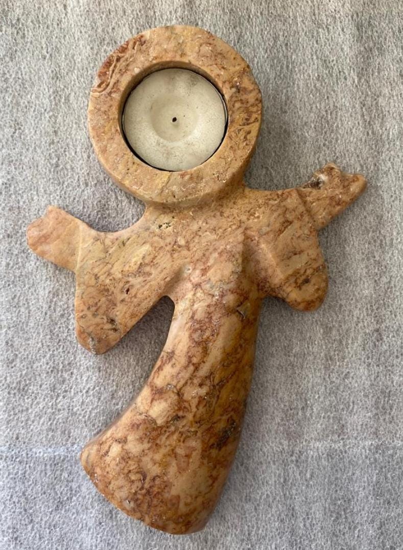 Eleva el significado de tus momentos más sagrados con este porta vela en forma de ángel. Tallado en auténtico Mármol Travertino Rojo, esta pieza destaca por sus tonalidades cálidas y sus vetas naturales únicas, que simbolizan la pasión y la vida. Es un objeto de devoción que no solo ilumina un espacio, sino que también sirve como un recordatorio permanente de protección y paz.