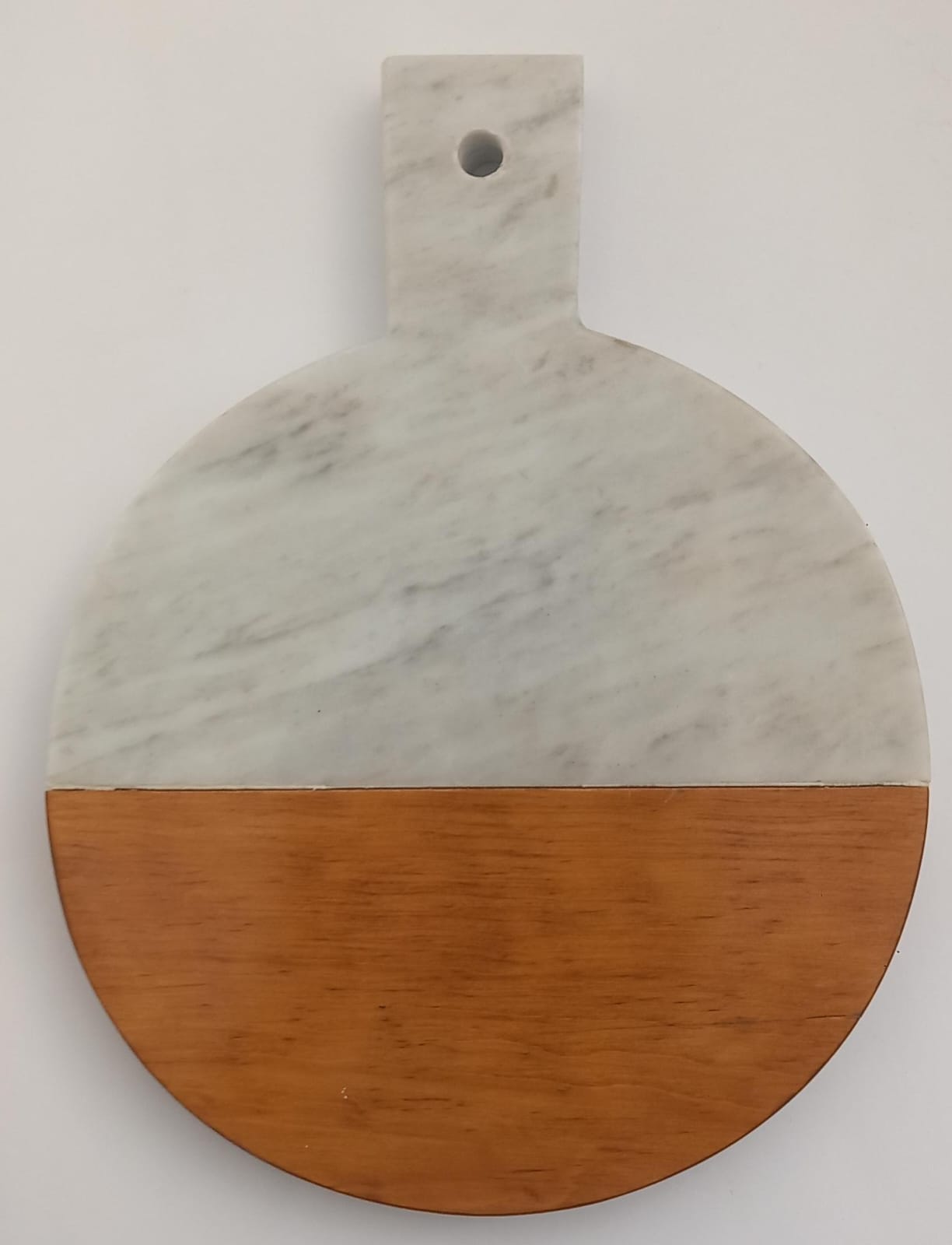Lleva la elegancia de un restaurante de lujo a tu hogar con nuestra tabla circular híbrida. Esta pieza combina magistralmente la suavidad del mármol blanco con la calidez de la madera, creando una superficie versátil y altamente estética. No es solo una herramienta de cocina; es una pieza decorativa que eleva cualquier espacio donde se coloque.